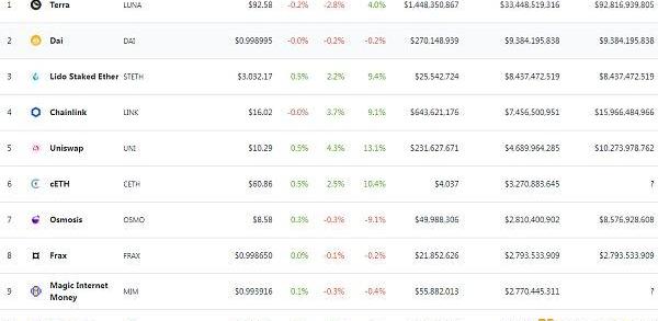DeFi項目鎖定資產前十排名及鎖倉量數據來源:defillama