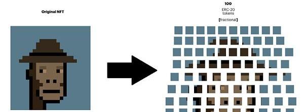 舉個例子來說,把一個CryptoPunks朋克風像素頭像分割為100個ERC-20標準的代幣PUNKS,那么,這個NFT所有權就被分割成了100份,每個PUNKS的持有人可擁有這副作品的1/100的所有權。