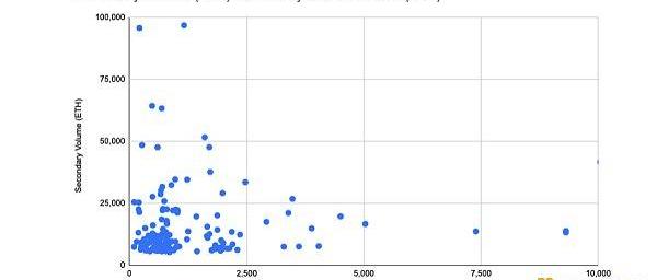 一級銷售收入和二級交易量顯示出類似的負相關。事實證明,許多在造幣廠籌集的資金很少的項目在二級市場上獲得了巨大的吸引力。