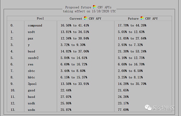 下一周期的起點是10月15日,按目前的投票比例,像compound池子的最低crv年化收益會從16.56%提升到17.70%,當然這里也有些會下降,比如usdt可能會從13%掉到5%。