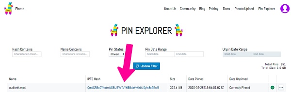 在“Pin Explorer”里,找到你剛剛上傳的音頻文件并點擊“IPFS Hash”鏈接。