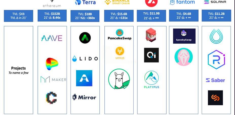 從2017年到2021年,幾個旨在提高交易速度并降低成本的L1和L2解決方案相繼問世,其中最知名的區塊鏈包括Polygon、Avalanche、Optimism、Terra和Solana。這些區塊鏈利用智能合約功能,吸引了開發人員構建多個開源金融應用程序和游戲等。