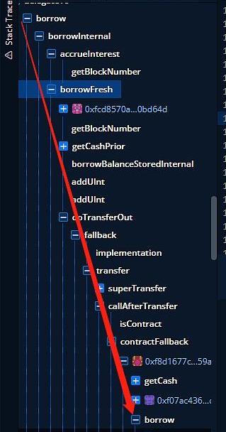 在HundredFinance攻擊中攻擊者重入的調用路徑如下: