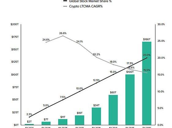 Grayscale的長期加密資本市場假設表明,加密市場總價值和全球股票市場份額在7年內可能達到約10萬億美元,在15年內達到約35萬億美元,在25年內達到約100萬億美元。