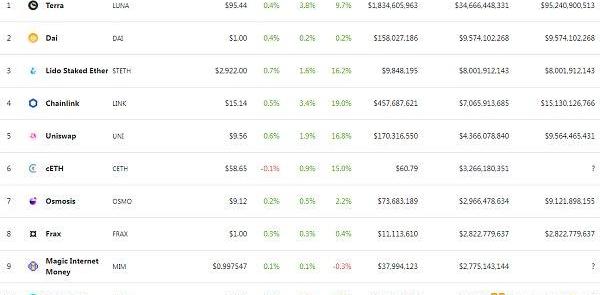 DeFi項目鎖定資產前十排名及鎖倉量數據來源:defillama