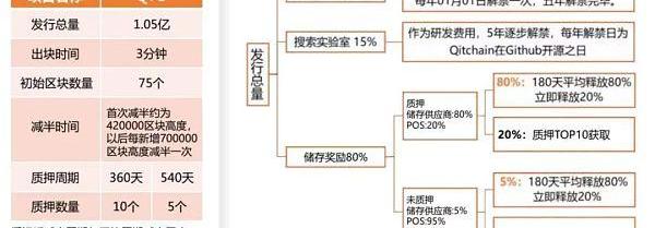 搜索實驗室15%:作為研發費用,鎖倉期為5年,每年Qitchain在Github開源之日進行釋放。區塊產生80%,獎勵規則如下:初始區塊:平均3分鐘一個區塊;每個區塊產生75QTC;首次減半時間約為420000區塊高度,之后每新增700000區塊高度減半一次。設置質押模式,在進入項目生態初期,需要一定的質押幣,質押機制分為兩種:第一種周期質押360天,1T需10QTC;第二種質押540天,1T需5QTC。質押需求隨著區塊同步減半。