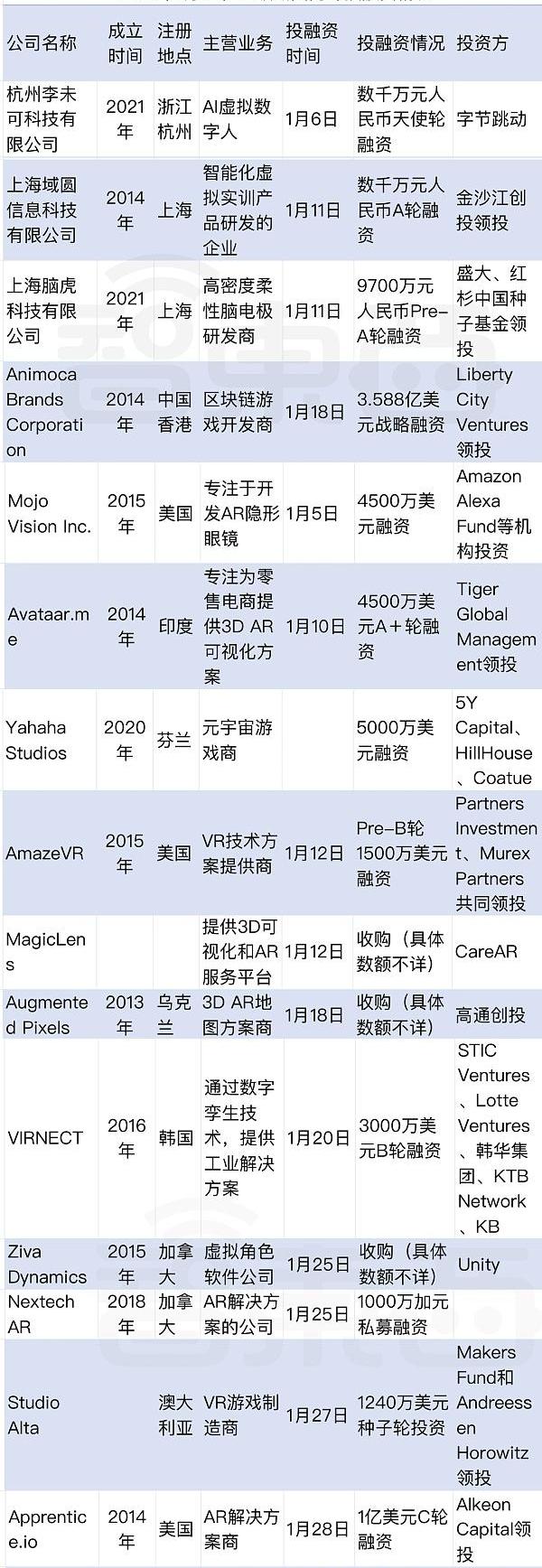 一些中小型企業也正乘勢而起。據統計,今年1月國內外XR行業共完成15筆融資并購,國內4筆,國外11筆,總金額約為7億6105萬美元。