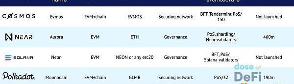 具體來說,Polkadot已經添加了Moonbeam、Near推出Aurora,并且很快,Evmos將在Cosmos上線和Neon將在Solana實現。?