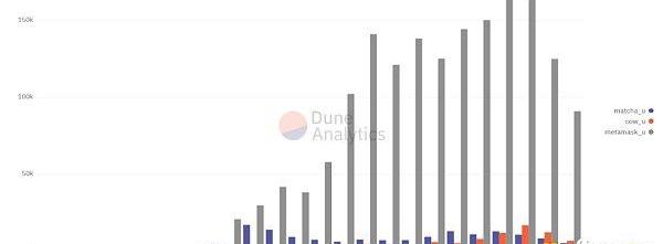 有意思的結論是,Metamask的用戶數量遠遠超過其他的面向終端用戶的聚合器的用戶數量。然而,Metamask的交易量卻一直都低于Matcha,表明兩個應用的用戶畫像有所不同。