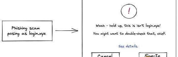 該規范還為錢包引入了額外的安全要求,例如防止網絡釣魚攻擊的域綁定和防止重放攻擊的隨機數,在整個體驗過程中進一步保護用戶。例如,如果錢包找到有效的SIWE消息,但用戶正在為example.com簽名,但實際上是在exampie.com上,則錢包可以警告用戶以下情況: