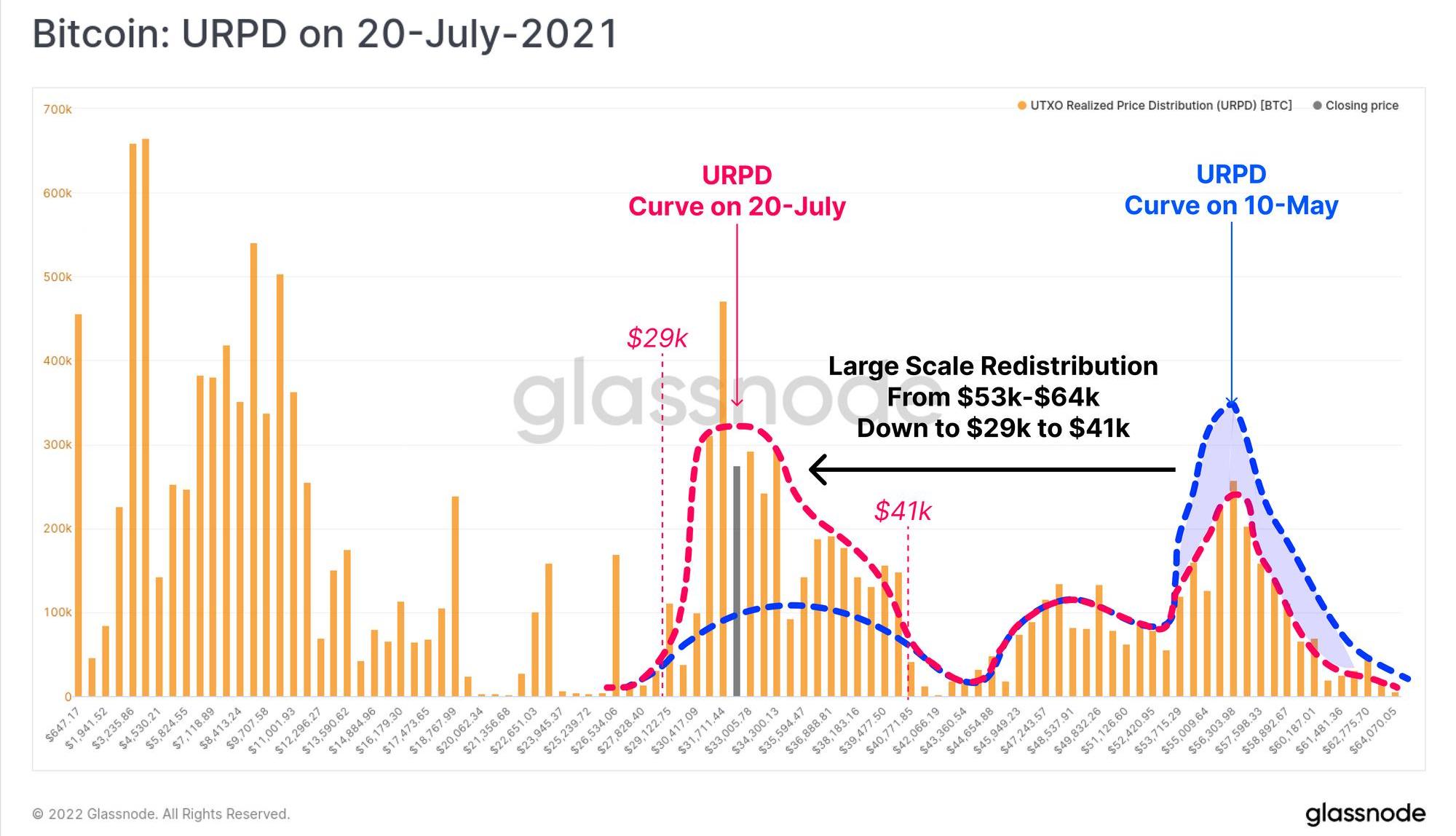 我們將從URPD指標開始深入分析,該指標顯示了代幣供應分布最后一次在鏈上移動的價格。我們希望在這里探討的是投資者在這次縮水期間的行為,與2021年5月至7月類似規模縮減期間行為的異同。