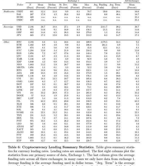 表6的最后一列顯示了當包括其他兩個交易所的數據時的平均貸款利率。我們有USDT、DAI、BUSD、USDC、BTC和ETH等其他交易所的利率。我們計算一種貨幣的貸款利率時,首先對該貨幣當天可用的所有匯率取平均值,然后對該時間序列取平均值,因為時間樣本沒有重疊。我們沒有另外兩家交易所的資金規模或長期資金數據。所有交易所的平均貸款利率都高度相關。