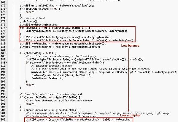 更新是在閃電貸的過程中觸發的,此時的閃電貸還未結束,借出的金額也還未歸還,因此Bank合約的當前余額遠小于正常值。此Bank合約也是某個strategy的一部分,因而使得某strategy的余額小于正常值,進一步導致multiplier小于正常值。