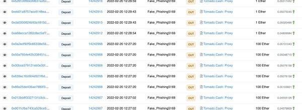 之后,該黑客將獲得的ETH通過不同的額度轉入混幣平臺Tornado.cash,約為1115個ETH。交易截圖如下:
