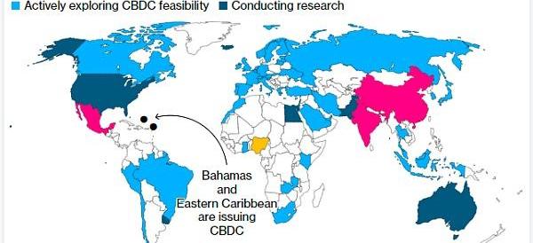 上圖中,黃色部分表示已經發行CBDC的國家;粉紅色部分表示計劃發行CBDC的國家;淺藍色部分表示正在積極探索CBDC可行性的國家;深藍色部分表示正在開展CBDC研究的國家。圖源:Bloomberg