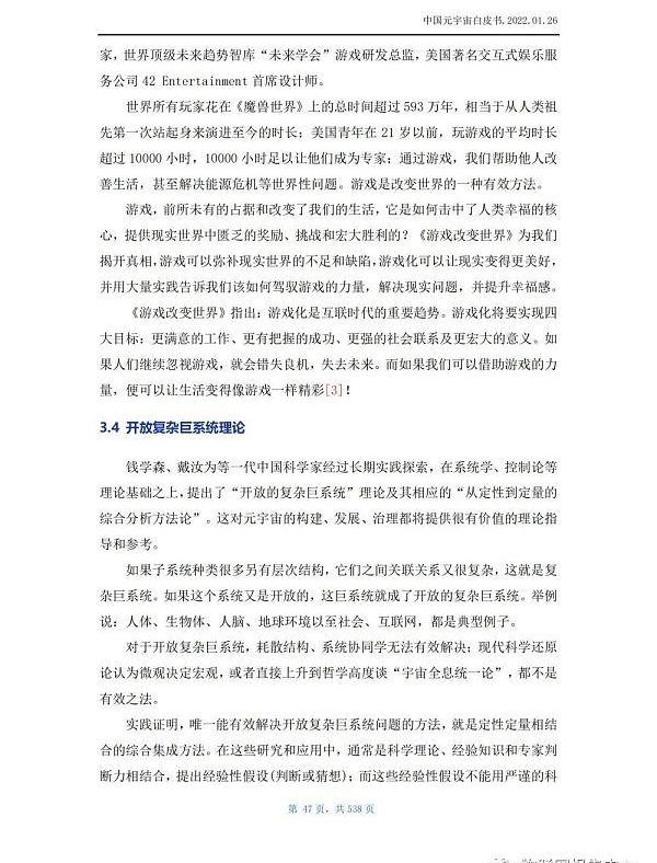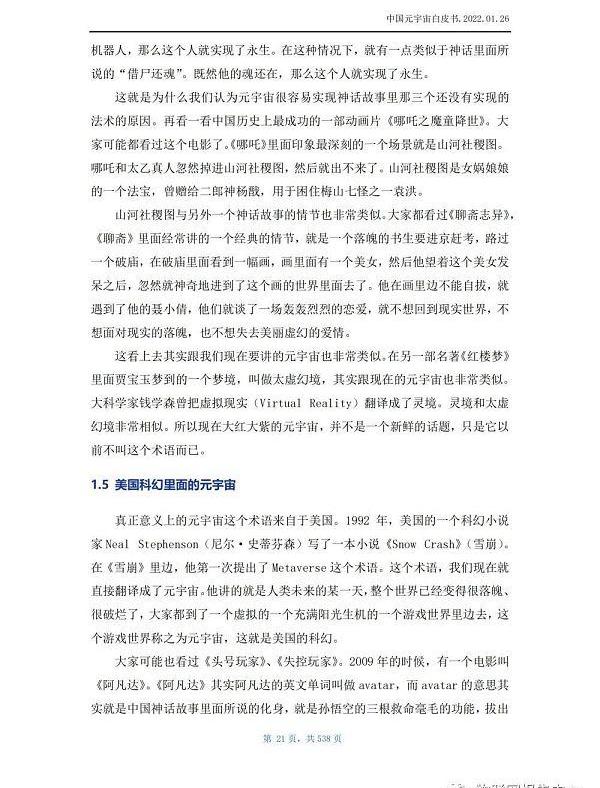 XRP/HKD-3.35%近日,2022《中國元宇宙白皮書》在北京中關村正式全網發布。該白皮書由國科創新研究院首席科學家,中關村數字媒體產業聯盟常務副秘書長,中關村數字媒體產業聯盟元宇宙實驗室執行主任龔才春主編。由北京信息產業協會、中關村數字媒體產業聯盟、中國科技新聞學會大數據與科技傳播專業委員會等組織起草。該白皮書分為緣起篇、現狀篇、技術篇、產業篇、法律與監管篇、倫理與風險篇、經濟篇、人才篇、暢想篇這九個篇章,從元宇宙的緣起、發展現狀、技術支持、相關產業等方面進行了全面、深入、細致的分析、總結和暢想。白皮書全本PDF電子版538頁。