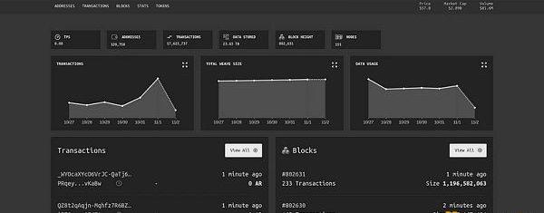每一個區塊鏈都需要有一種讓公眾來監控交易、地址、區塊和網絡統計數據的方式——ViewBlock作為permaweb的主要區塊探索器,為Arweave提供了這個方法。為了監測貨幣交易目前是否已經被開采成區塊,或者SmartWeave合約互動是否失敗,都可以通過使用ViewBlock來將它們輕松解決。在此你還可以獲得區塊鏈的總規模、每日交易數量、節點位置等統計信息。