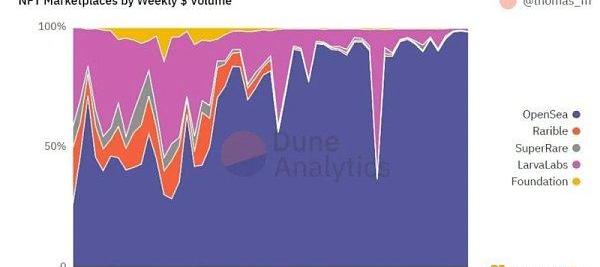 據DuneAnalytics數據,OpenSea的市場占有率一路飆升,從2021年7月的61%以上提升至2021年12月底的95%,穩居NFT交易市場第一。