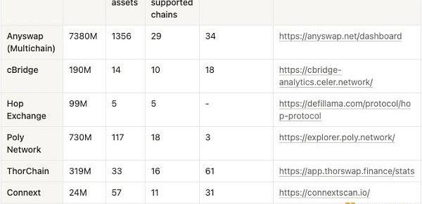 通過上述表格可以看出,目前擁有節點數最多的是ThorChain,其次是Anyswap和Connext.然而,ThorChain并未披露其節點運行者的具體信息,匿名運行者的可靠性存疑,縱使擁有按節點數量評估下最高的去中心化程度,依舊要為其安全性畫上一個問號。