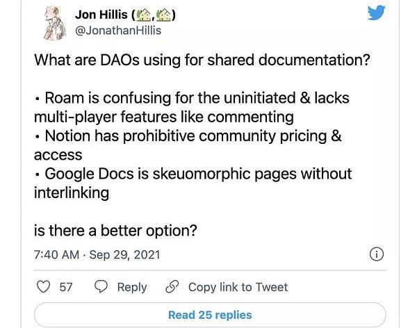 文檔和團隊知識管理工具是DAO的一大痛點。目前還沒有可行的基于web3原生的解決方案,所以我們只能使用常見的web2技術工具:Notion、GoogleDocs和Roam。
