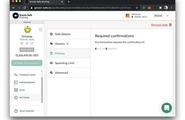 用于UNI獎勵的GnosisSafe多簽的屏幕截圖。這是一項由Uniswap資金支持的激勵項目。這個基金委員會需要6個多簽賬戶中的4個簽名來確認。