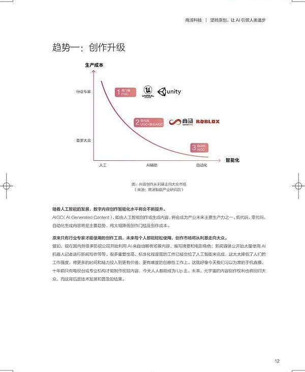 隨著人工智能的發展,數字內容創作智能化水平將會不斷提升。AIGC,即由人工智能創作或生成內容,將會成為產業未來主要生產力之一。低代碼、零代碼、自動化生成內容將是主要趨勢,將大幅降低創作門檻及創作成本。原來只有行業專家才能使用的創作工具,未來每個人都能輕松使用,創作市場將從利基走向大眾。