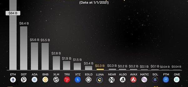 LUNA1月份的市值為3億美元,與其他區塊鏈平臺原生代幣的市值相比,排名第9。