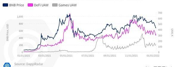 在BSC上,與游戲和DeFi中的使用情況類似,以及它們各自與BNB價格的關系。連接到BSC的DeFidapp的UAW遵循與BNB價格類似的軌跡。再次展示了DeFi與其原生加密貨幣成本之間的相關性。同時,游戲的使用與BNB的價格無關。盡管BSC游戲依賴于游戲的原生Token,但它們的行為更多是從微觀角度來看,例如SKILL或JEWEL等特定Token只會影響其主機dapp的使用。