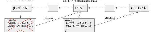 為了啟用快速同步,我們有一個周期性的快照區塊。一個快照區塊包含前狀態哈希這一附加信息,即前一個快照區塊的后狀態哈希: