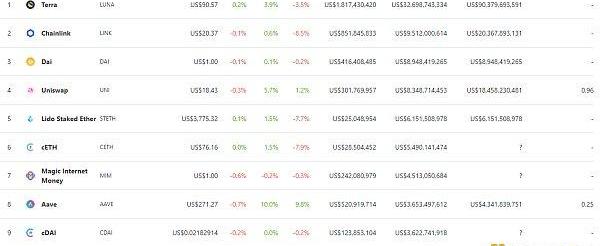 DeFi項目鎖定資產前十排名及鎖倉量數據來源:defillama