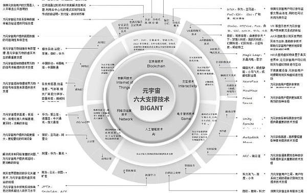根據《元宇宙通證》一書,元宇宙有六大支撐技術BIGANT,分別為區塊鏈技術(Blockchain)、交互技術(Interactivity)、電子游戲技術(Game)、人工智能技術(Ai)、網絡及運算技術(Network)、物聯網技術(IOT)。在這之中,區塊鏈技術往往被視為元宇宙的核心支點。