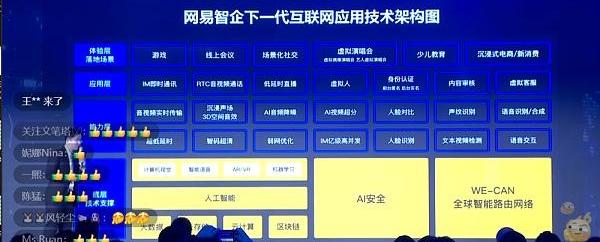 會上,阮良公布了網易智企布局下一代互聯網技術應用的技術架構圖,以此為“元宇宙”發展提供基礎。如下圖所示,通過全球智能路由網絡、云計算、人工智能等底層技術能力,網易智企提供覆蓋音視頻實時傳輸、語音識別/合成、人臉比對等能力,進而支持上層的游戲、線上會議、場景化社交、虛擬演唱會、少兒教育等多種體驗場景。