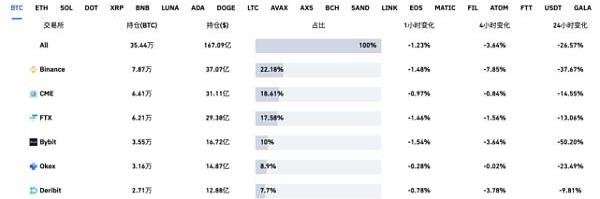 根據Coinglass網站數據,從比特幣持倉量來看,截至4日晚9點區塊鏈交易平臺幣安的比特幣合約持倉占比達到了22.18%,在各平臺中排名第一。