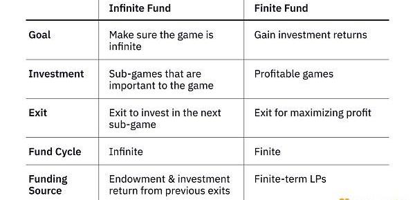 無限基金具有無限基金周期,通過投資其子游戲來投資無限游戲。子游戲可以是有限游戲,但無限游戲才是最終目的。為了評估,比較無限基金和有限基金之間的差異,我們可以從這五個指標進行考量:目標、投資動機、退出策略、基金周期和資金來源。