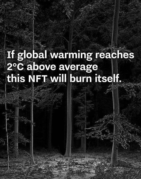 該作品聚焦生態環境,其通過特殊的智能合約技術,將一個特殊條件寫入該作品中:如果地球溫度再上升2度則任何人都可以通過智能合約將該NFT作品銷毀。“正如這些樹木會在更高的溫度中消失一樣”。
