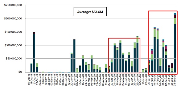 另一波認購高潮在7月底至9月底。對應的份額解鎖期在2021年1月份至2021年3月份。目前進入2020年四季度,灰度比特幣信托持倉量已經在10月份增加了1.7萬個,事實上認購高潮一直在持續,那么到明年4月份之前都有天量的信托份額會解鎖。隨著供需格局不斷發生變化,市場上存量的比特幣逐漸減少,再加上套利資金回流,有鑒于此,我們持續看漲比特幣本年四季度及明年全年的行情。?