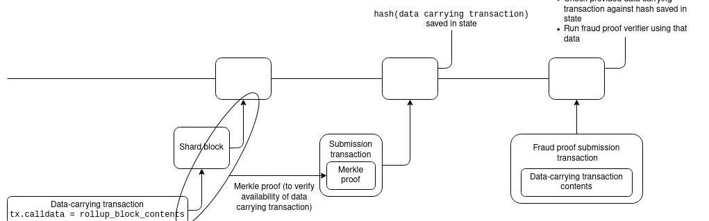 分片世界和目前狀況的一個主要區別是,在分片世界中,一筆向智能合約提交rollup區塊的交易中將不可能包含rollup數據。相反,數據發布步驟和rollup區塊提交步驟將不得不分開:首先,在數據發布步驟中將數據發布至鏈(發布到分片里);然后在提交步驟中,提交其區塊頭以及基礎數據的證明。