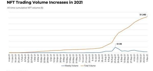 上圖:NFT的累計交易量(橙線)和周交易量(藍線)的增長情況,數據截至2021年11月22日。
