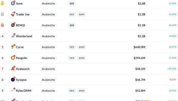 Avalanche鏈上DeFi鎖定資產前十排名及鎖倉量,數據來源:Debank