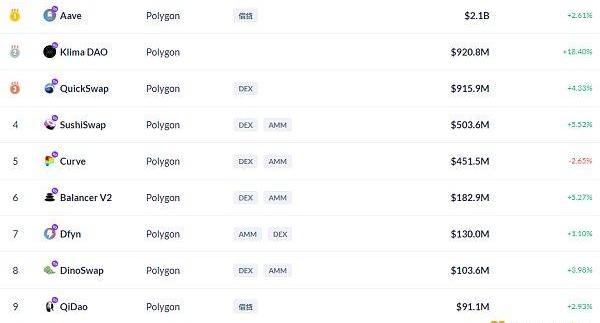 Polygon鏈上DeFi鎖定資產前十排名及鎖倉量,數據來源:Debank