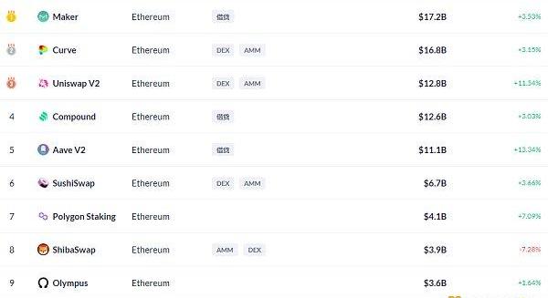 Ethereum鏈上DeFi鎖定資產前十排名及鎖倉量,數據來源:Debank