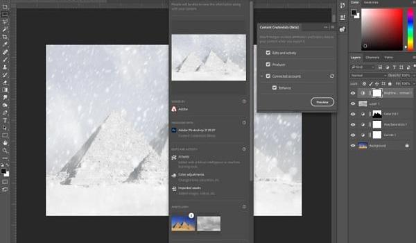 據Adobe官方介紹,「內容憑證」功能啟用后,PS會在后臺自動從創作圖像中捕獲身份信息,之后創建者可以在導出圖像時將此信息附加到圖像。這種安全的元數據為創意專業人士和休閑藝術家等提供了新的透明度選項,同時也增強了人們對數字內容的信任。