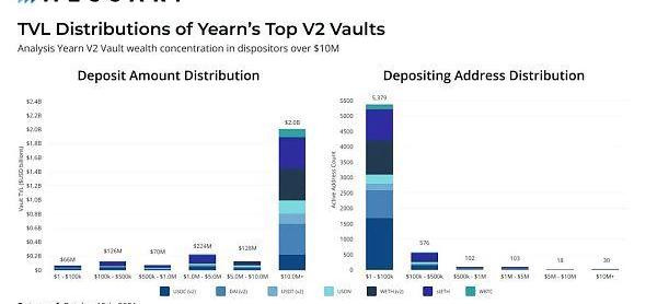 了解V2金庫的財富分配情況后,根據從唯一地址存入的TVL的數量,將不同的儲戶群體分成若干組。例如,存款人在1美元和10萬美元之間是一個,10萬美元和50萬美元之間是另一個,然后是50萬美元到100萬美元一個組,以此類推。這樣做揭示了Yearn在其V2金庫中的存款人類型之間的明顯關系:財富集中度。