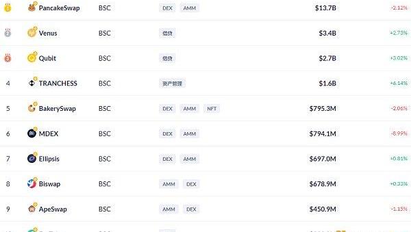 BSC鏈上DeFi鎖定資產前十排名及鎖倉量,數據來源:Debank