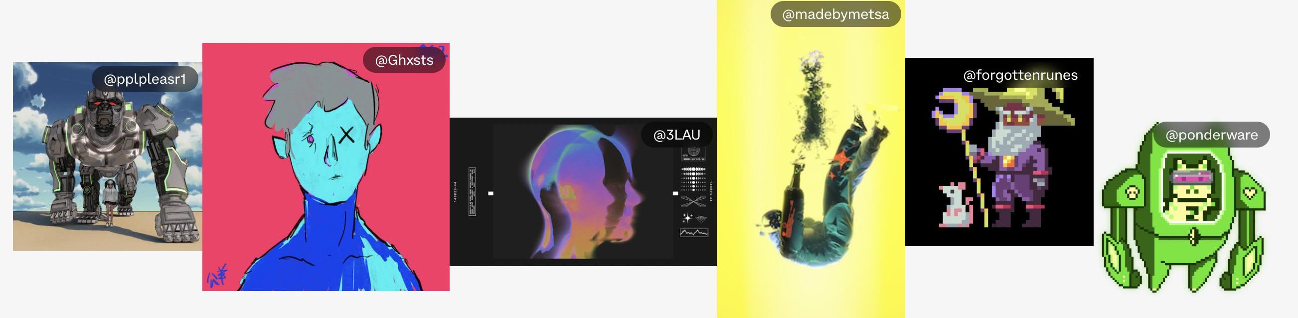 拿CoinbaseNFT平臺的網頁來說,除了“Create,Collect,Connect”這一碩大醒目的Slogan,以及加入“等待名單”的選項外,我們還能看到一些NFT作品以及創作者的名字,比如Ghxsts,3LAU,pplpleasr1,這些都是在NFT領域已具備相當知名度的創作者。
