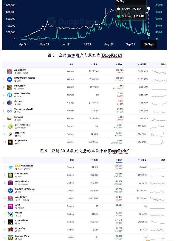 截至2021年9月27日,從DappRadar上的數據顯示全網累計已有836個游戲類Dapp上線部署,9月27日當天的游戲用戶量達到92.7萬人,日交易量達到1562萬美元。從2021年7月以來,鏈游數據迅猛增長,玩家從4月初的8萬人增長到9月的92.8萬人,日交易量從4月初的50萬美元左右增長到均值在4000萬美元左右的水平,最高日交易量超過了9300萬美元。