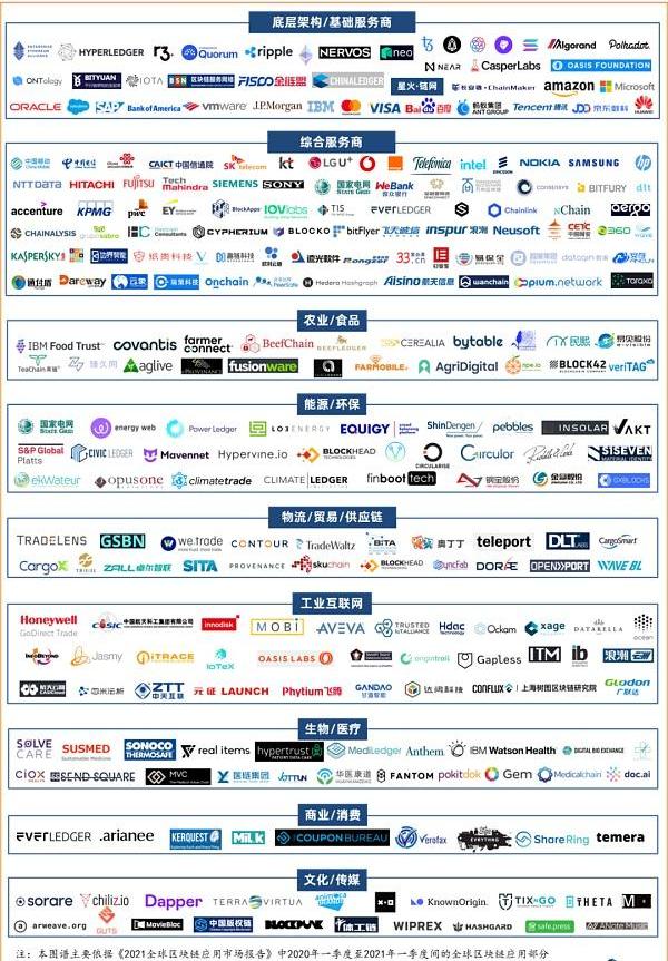 第一、圖譜主要依據《2021全球區塊鏈應用市場報告》中2020至2021年一季度間的部分區塊鏈應用典型案例,及其它公開信息制作,只是列舉典型機構,不具有行業統計與排名功能。