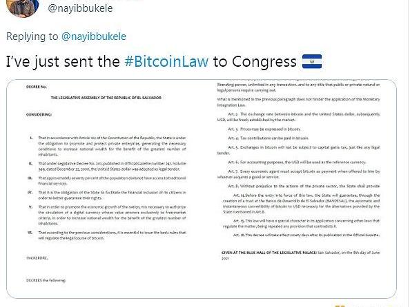 2021年6月9日10:00左右NayibBukele發推表示正式向薩爾瓦多共和國立法會提交比特幣法案。