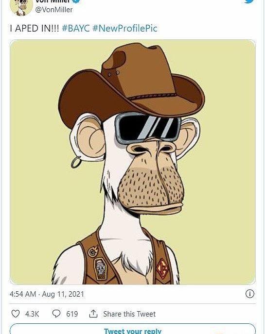 除此之外,還有許多來自丹佛野馬隊的退役和現役球員,也投身“無聊猿”NFT。其中,線衛馮·米勒就在8月初宣布自己購買了“無聊猿”NFT,此前,開球員布蘭登·麥克馬納斯和退役的野馬隊球員泰勒·波倫布斯和布蘭登·斯托克利也都進行了購買。事實上,波倫布斯在推特上說他曾擁有三個“無聊猿”NFT,然后將其中一個賣給了斯托克利。不僅如此,波倫布斯還表示,他擁有MicahJohnson的AkuNFT藏品,并發布了關于AlphabettyNFT的推文。