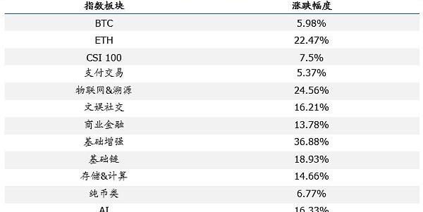 從細分板塊來看,物聯網&溯源、文娛社交、商業金融、基礎增強、基礎鏈、存儲&計算、AI表現優于ChainextCSI100平均水平,為24.56%、16.21%、13.78%、36.88%、18.93%、14.66%、16.33%;交易支付、純幣類遜于ChainextCSI100平均水平,為5.37%、6.77%。